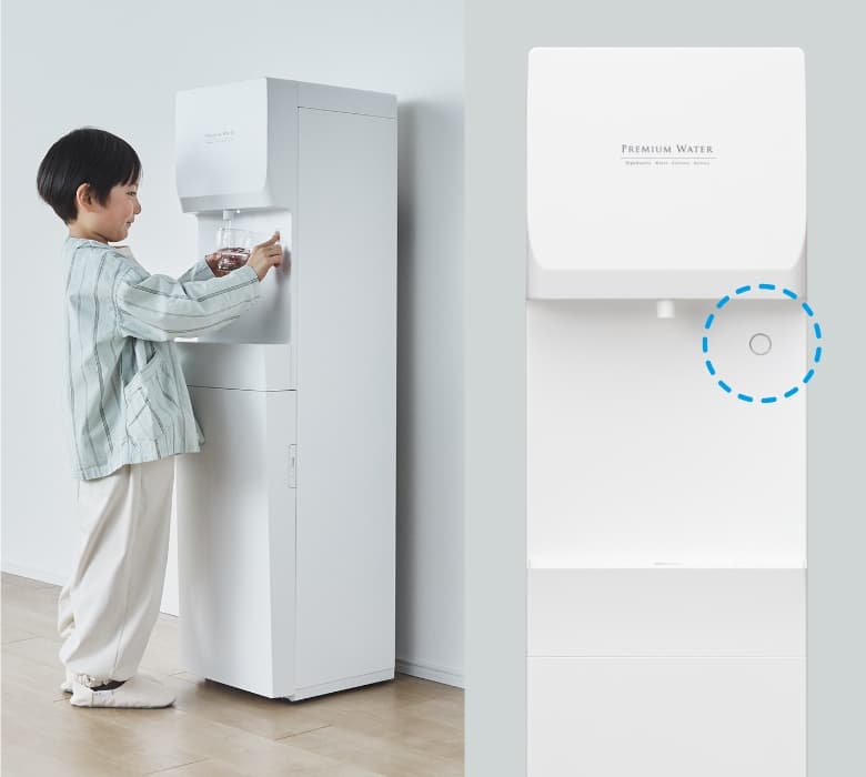 小さなお子さまでも簡単に冷水を出すことができるよう、出水口横(高さ87cmの位置)に冷水限定の出水ボタンを設置いたしました。座ったままでの操作にも便利な高さです。